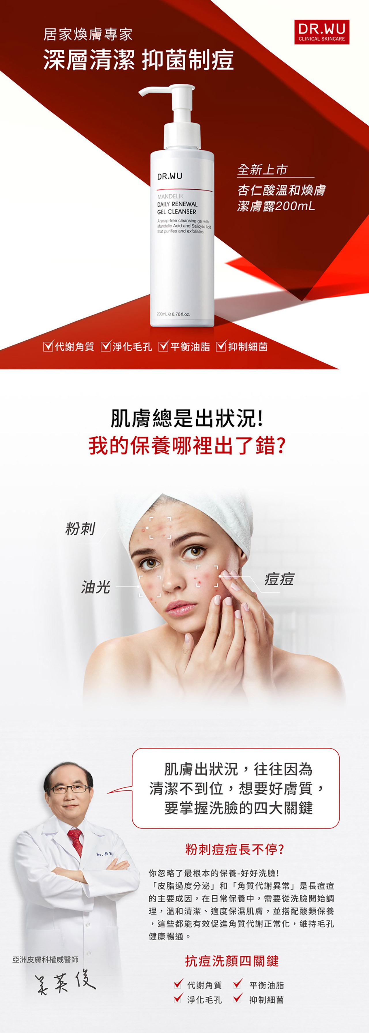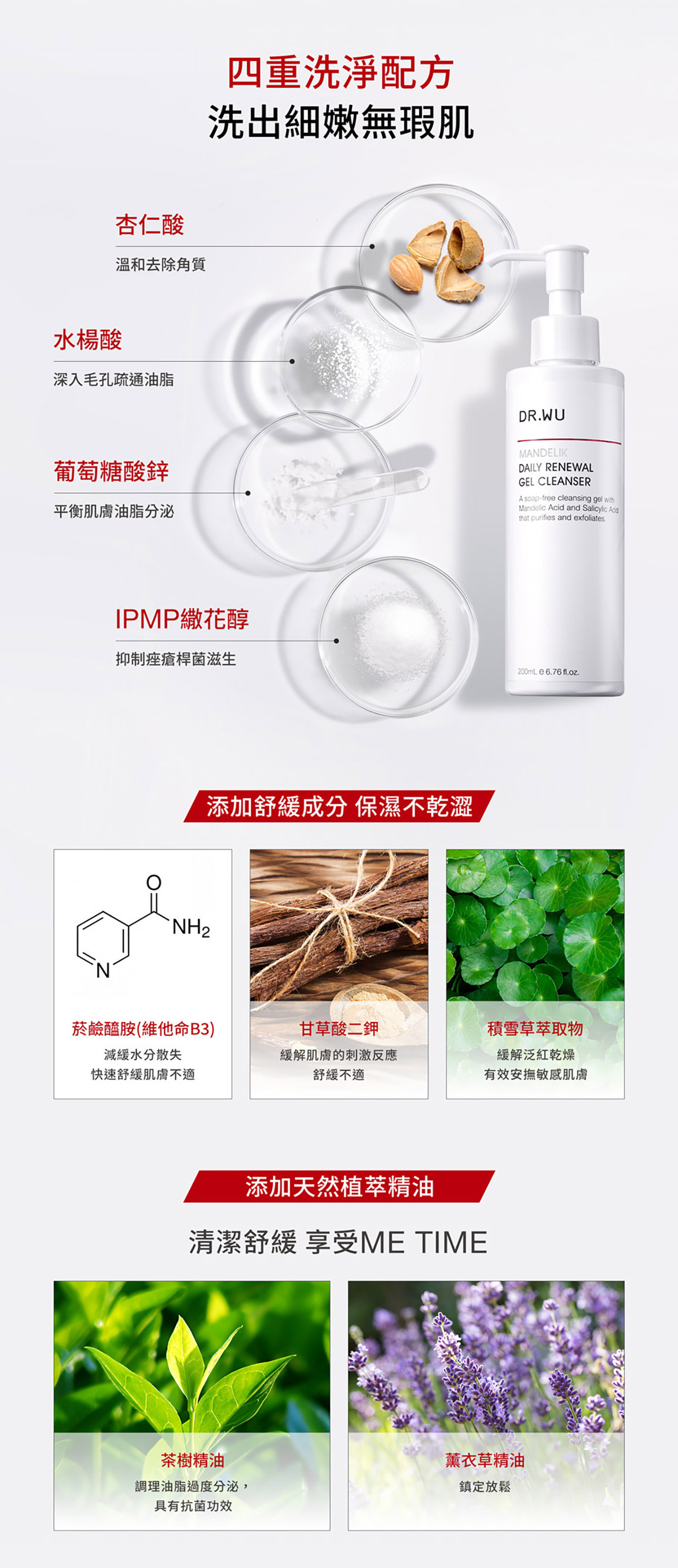 全新杏仁酸溫和煥膚潔膚露適用於臉部及局部身體肌膚粗糙、易出油長痘處不含皂鹼的清爽潔淨配方結合杏仁酸、水楊酸和葡萄糖酸鋅能有效淨化髒污、溫和去除老廢角質、調理皮脂分泌預防粉刺形成。另添加菸鹼醯胺(B3)、積雪草萃取及甘草酸二鉀維持肌膚保濕屏障、緩解乾燥不適洗後光滑保濕、不乾澀緊繃使肌膚更加清爽柔嫩。