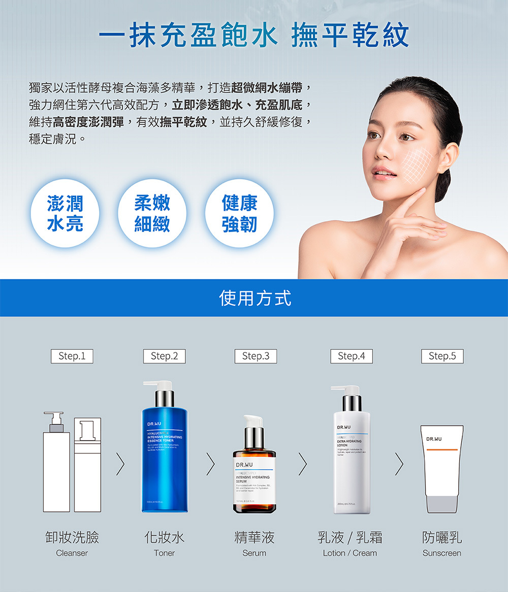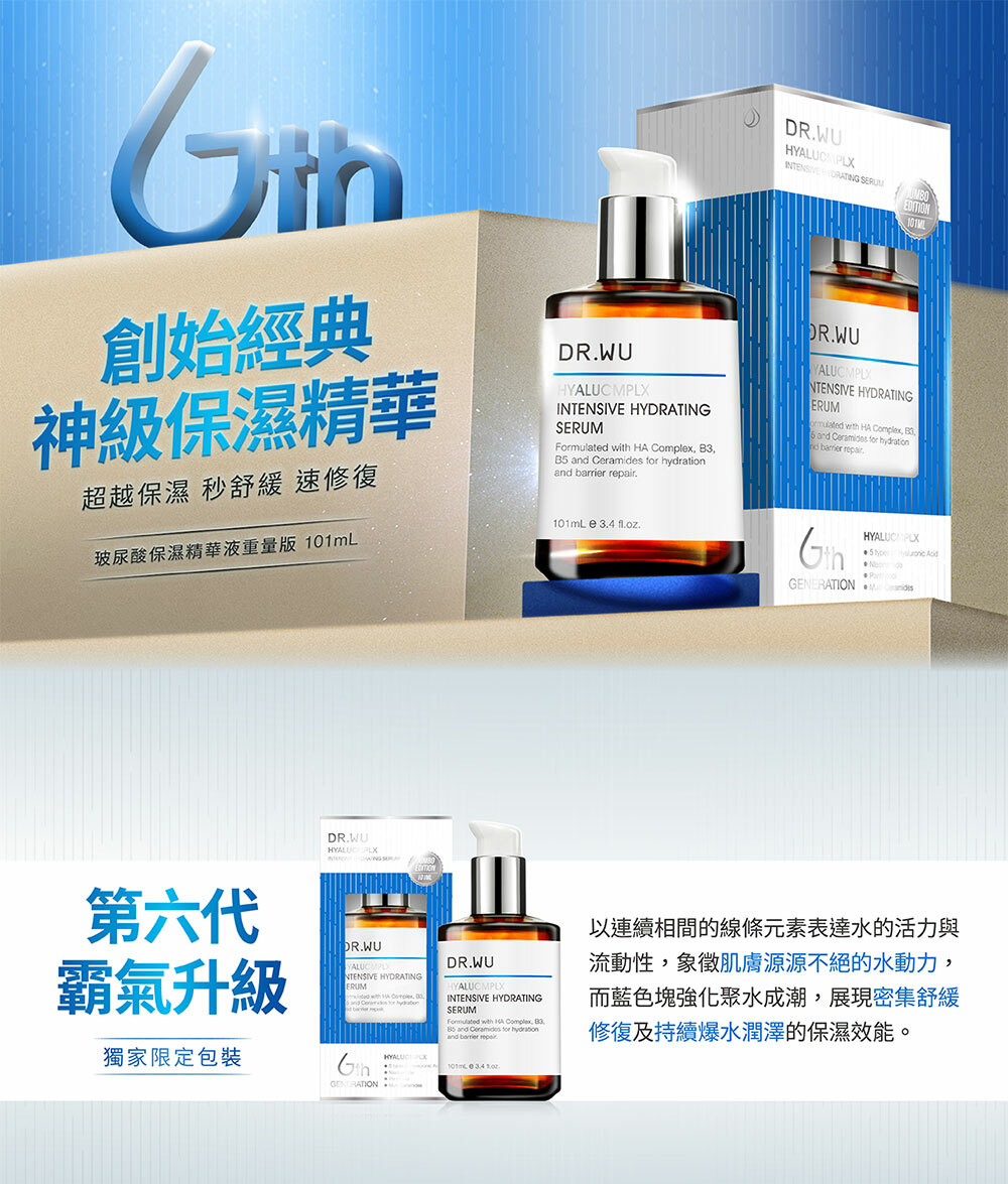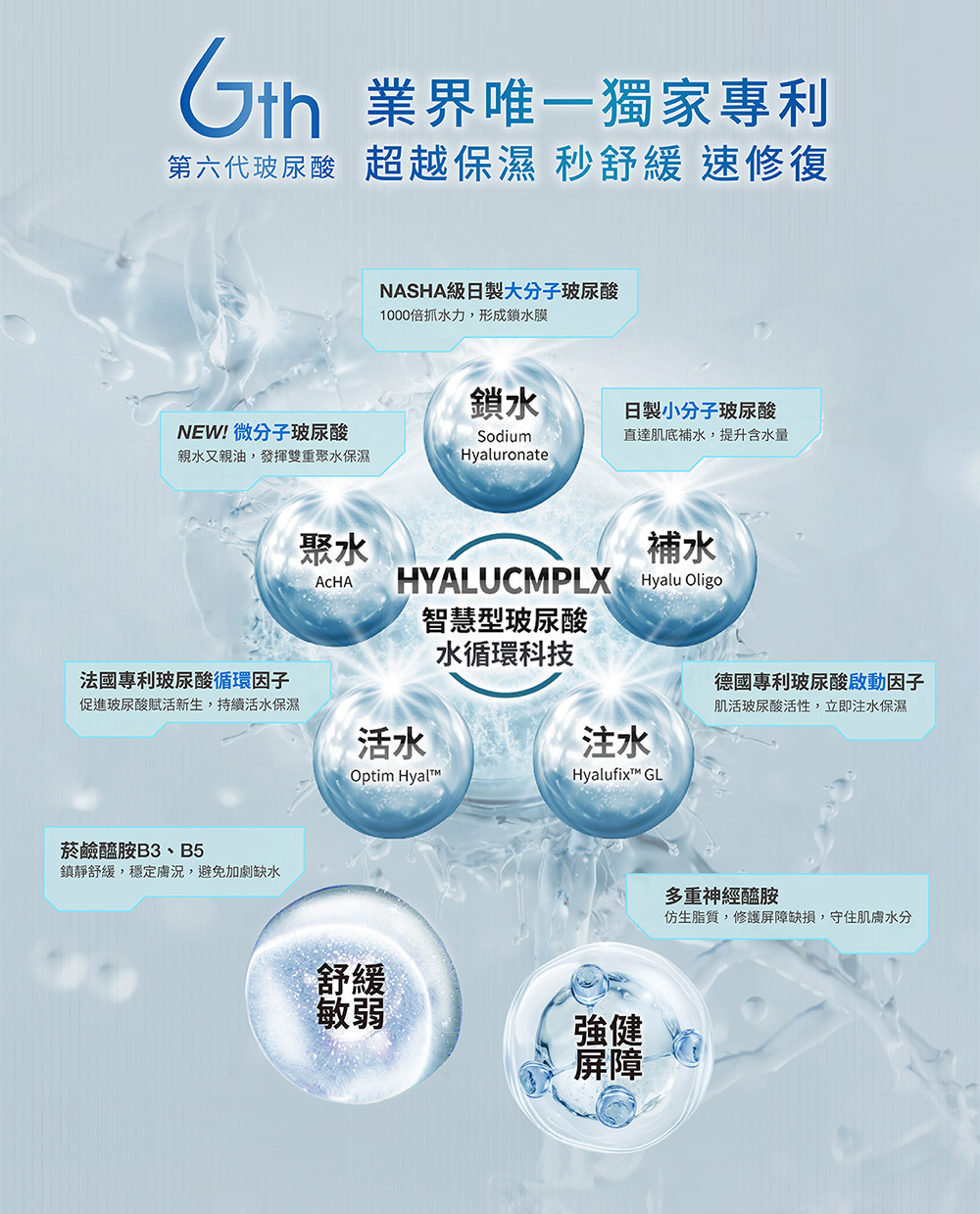 全新高濃度玻尿酸保濕精華液,運用第六代智慧型玻尿酸水循環科技,結合大、小、微分子玻尿酸、玻尿酸循環因子及啟動因子,從源頭進行鎖水、補水、注水、活水及聚水,長效深層保濕、潤澤肌膚,使肌膚柔嫩細緻,維持肌表屏障健全。另添加菸鹼醯胺(B3)、維他命原B5及三重神經醯胺,有效鎮定舒緩肌膚不適、修復屏障,提升肌膚對環境傷害的防護力。