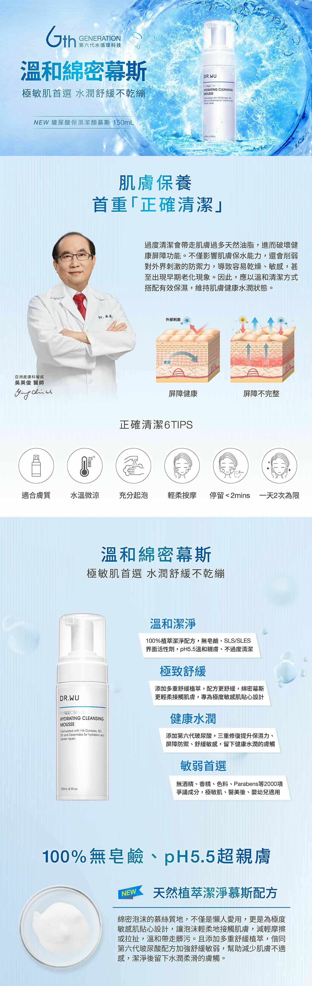 清爽慕斯質地完美搭配溫和潔淨配方,以綿密細緻的泡泡,深層淨化毛孔徹底去除髒污及多餘油脂;同時有效平衡酸鹼值,維持肌膚pH5.5弱酸健康狀態,減少肌膚乾燥不適,重建肌膚天然屏障。全新升級第六代智慧型玻尿酸水循環科技,完美結合大、小、微分子玻尿酸、玻尿酸循環因子及玻尿酸啟動因子,揮別洗後肌膚乾澀緊繃,提供肌膚細緻柔潤觸感;搭配菸鹼醯胺(B3)、維他命原B5、三重神經醯胺及多重舒緩植萃有助於修復肌膚屏障