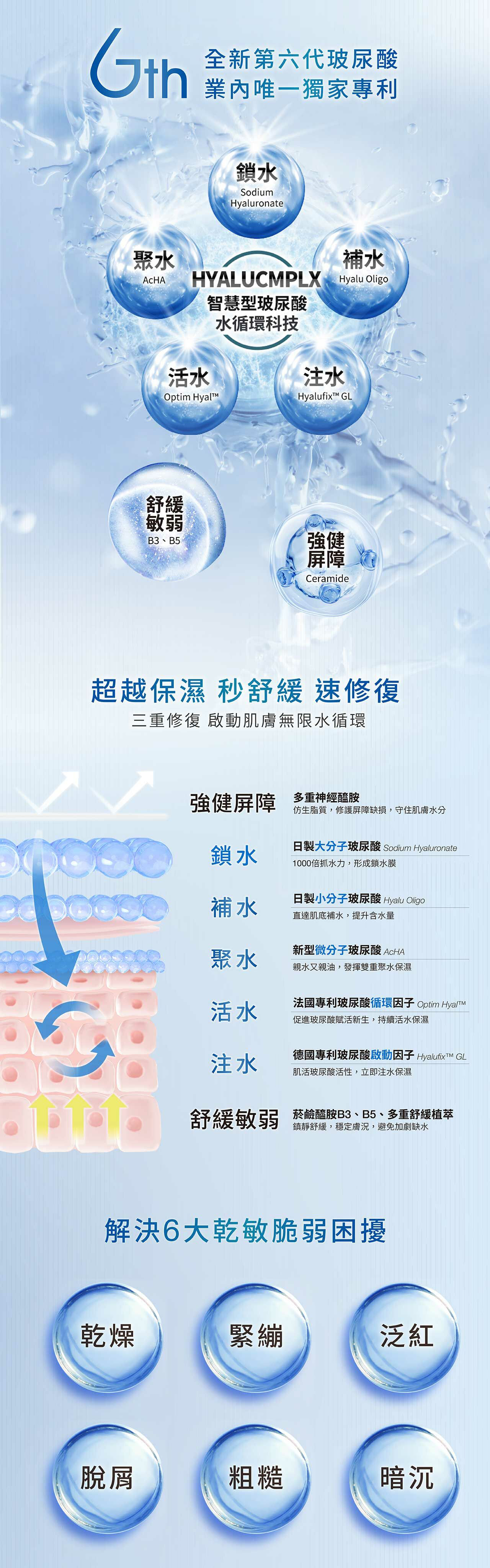 3.全新第六代玻尿酸,提升保濕力、修復屏障,搭配多重舒緩植萃,加強舒緩敏弱。