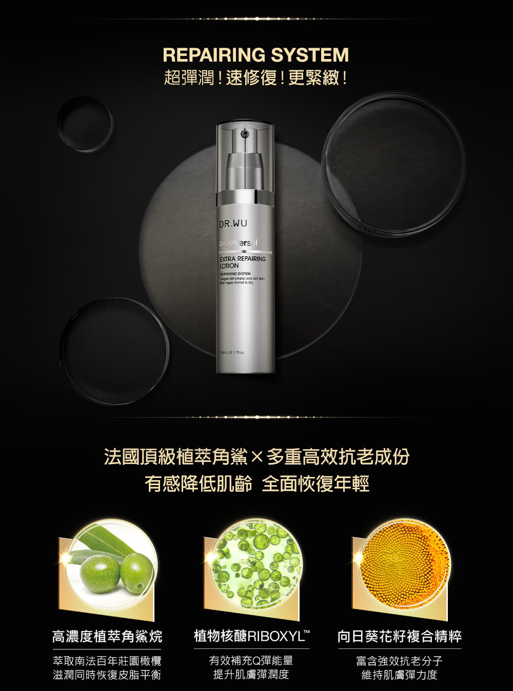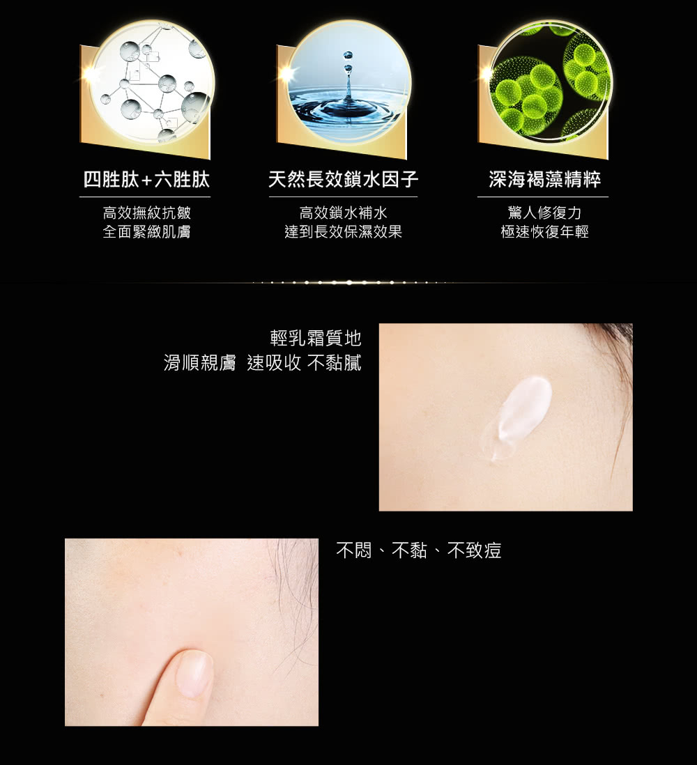 潤澤親膚 輕盈修復,獨特輕乳霜質地,結合高濃度角鯊烷、向日葵花籽精粹及多高效胜肽,親膚性極佳,保濕同時修復,提升肌膚彈性、減少細紋皺紋,更添加植物核醣,掃除疲憊、暗沉膚況,全面恢復年輕!
