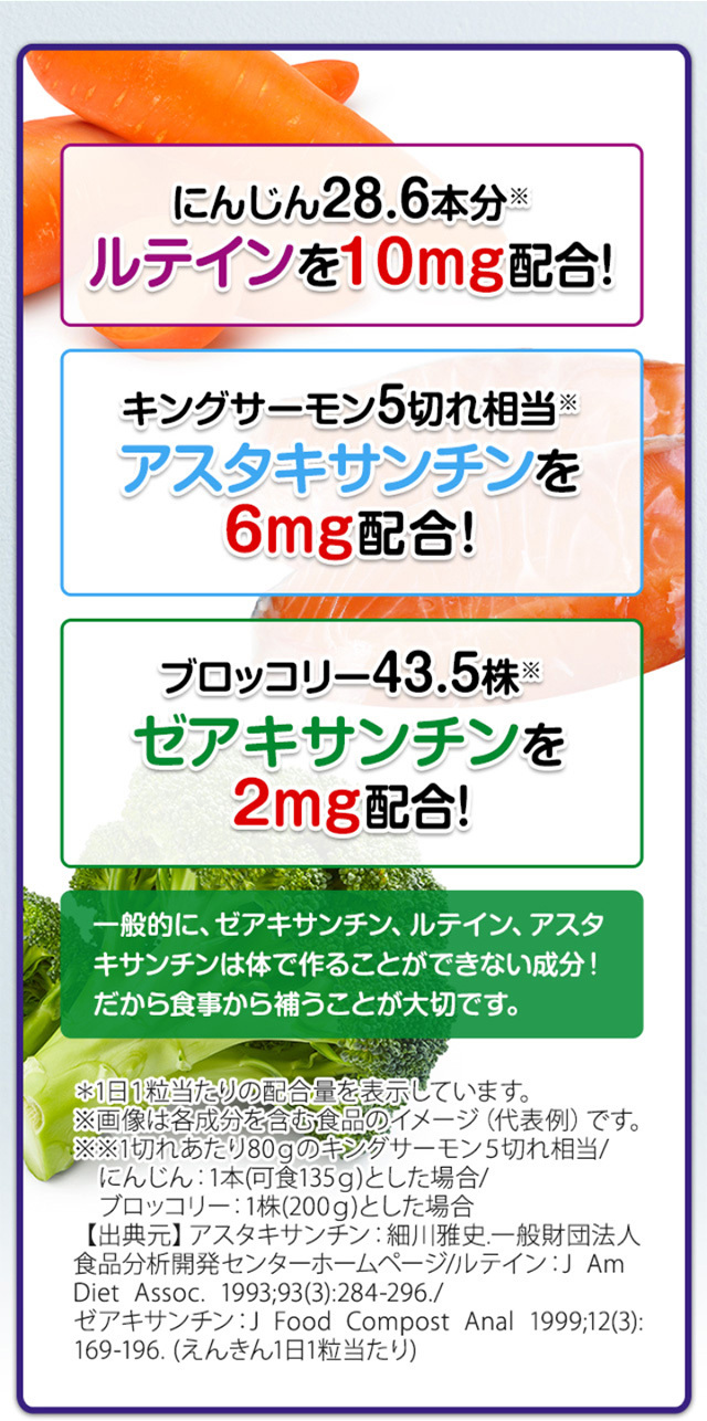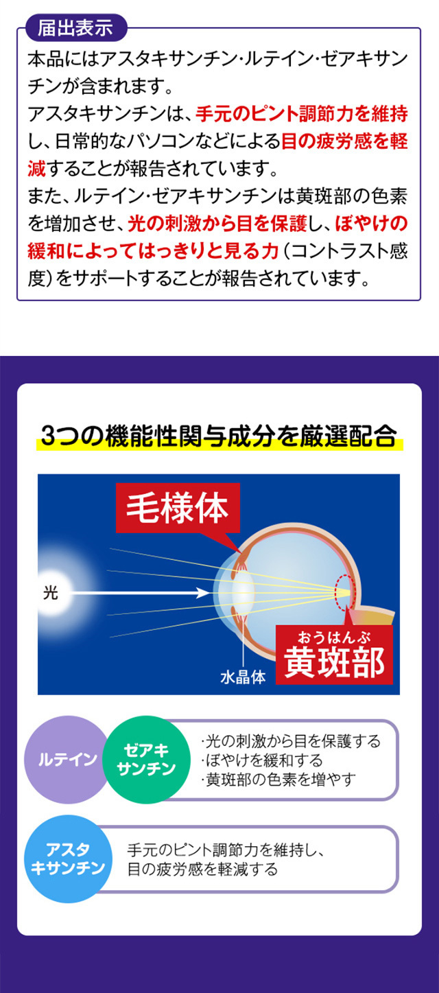 嚴選3種成分蝦青素、玉米黃素、葉黃素制成的功能性表示食品。