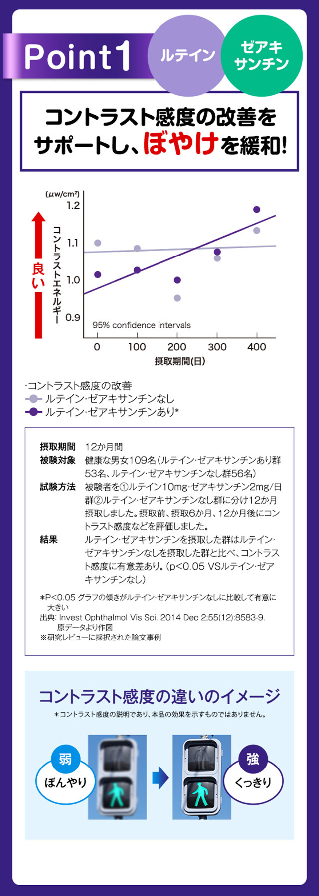 葉黃素和玉米黃質增加了黃斑中的色素沉著,保護眼睛免受光刺激,並通過減少模糊來支持清晰的視力(對比度敏感度)。