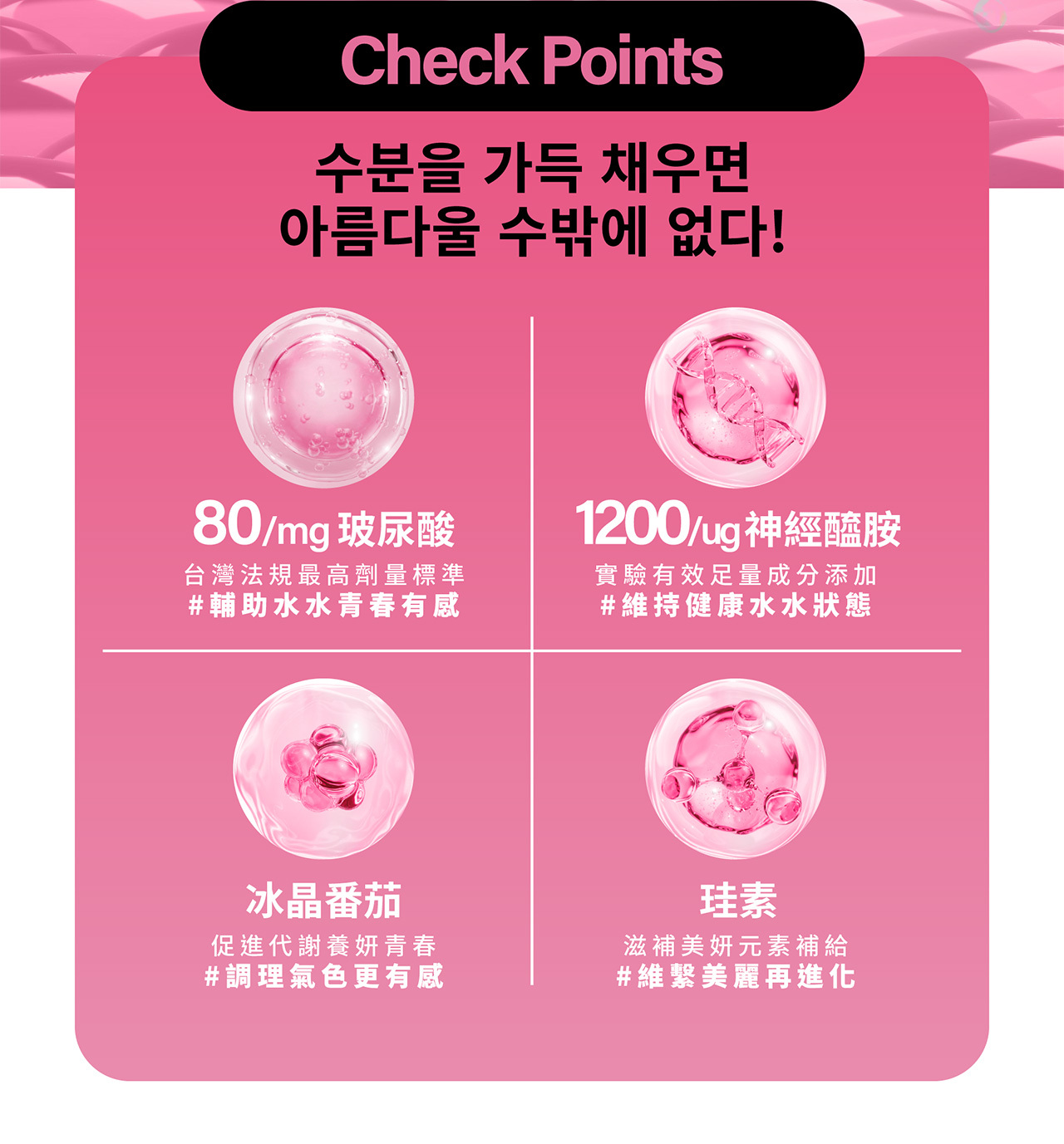 水、魚膠原蛋白、蜜桃濃縮汁、蘋果濃縮汁、流行鏈球菌發酵物(含透明質酸鈉)、