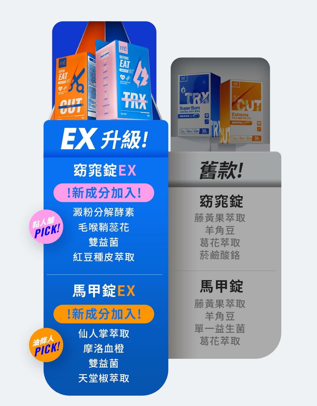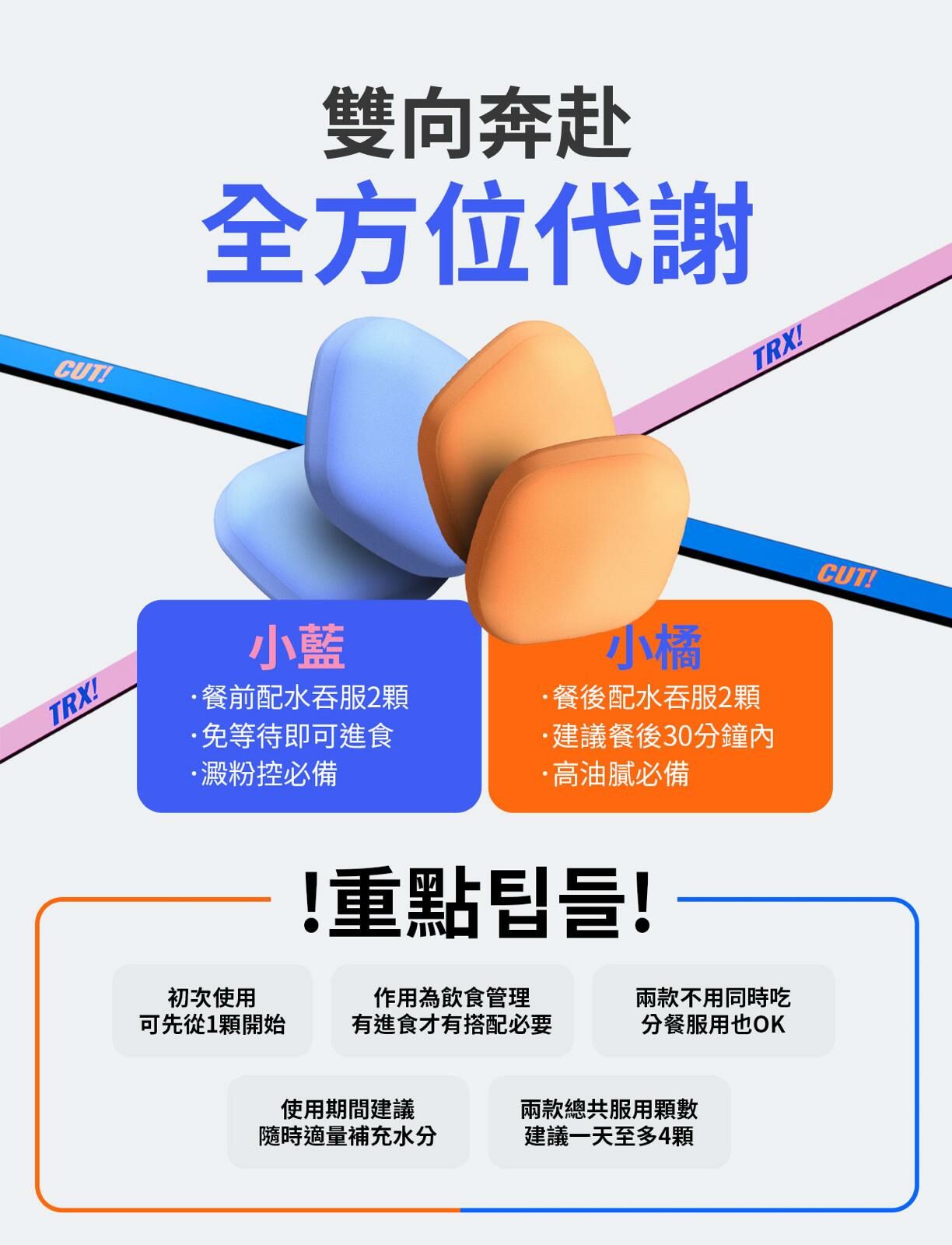 維持小藍小橘兩款搭配,不同功效,一個餐前一個餐後,餐前攔截,餐後包覆,全面閃避各種危積感!