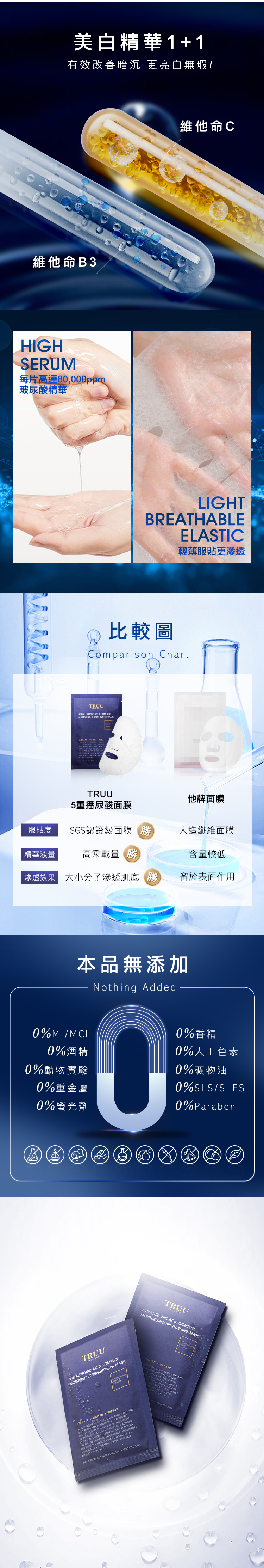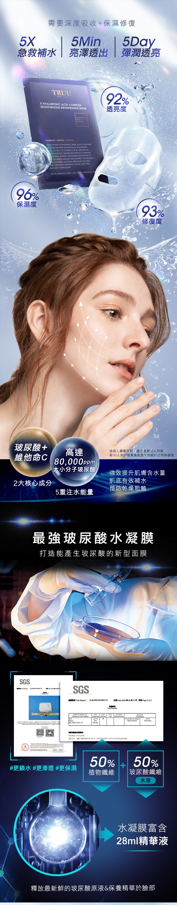 • 每片含高達8萬ppm玻尿酸精華,再添加維他命C更淨白勻亮!