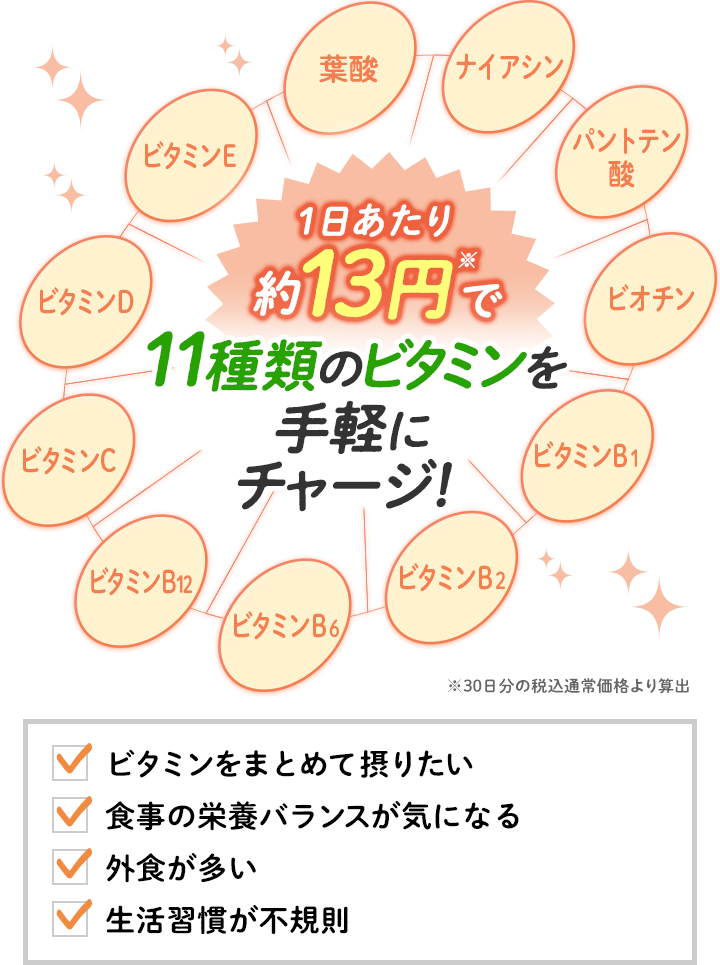 維生素是維持生命所不可或缺的營養素。其中又分成可溶於脂質的脂溶性維生素(如維生素A、D、E、β-胡蘿蔔素等)及可溶於水的水溶性維生素(如維生素B群、C等)。由於大多數的維生素無法由人體自行合成,而且容易因為運動、壓力、年齡增長等因素而逐漸流失,因此必須藉由食物攝取或透過營養食品來加以補充,以維持生理機能正常運作。