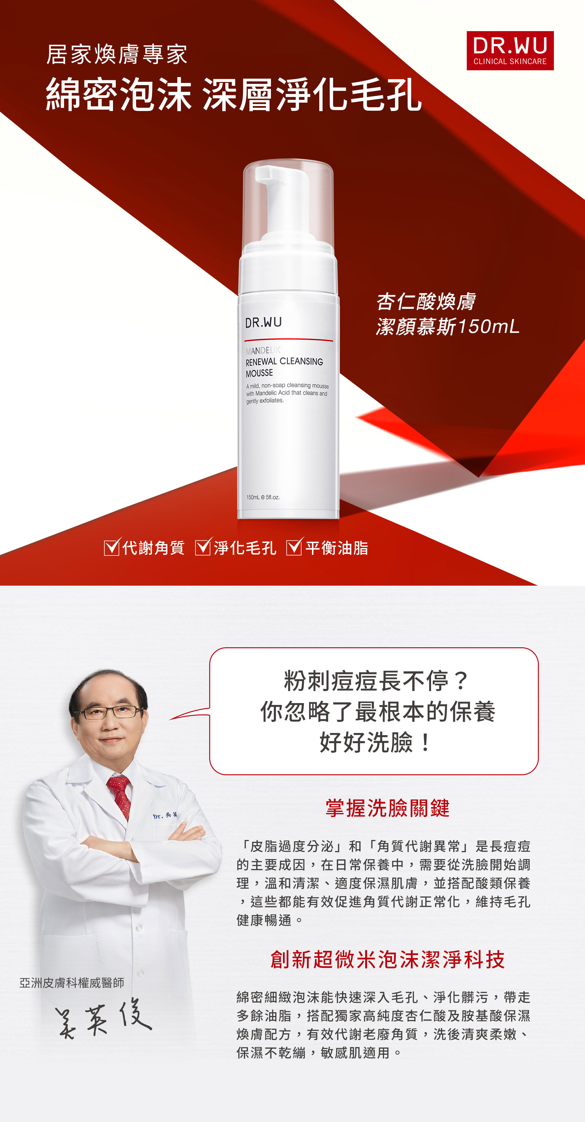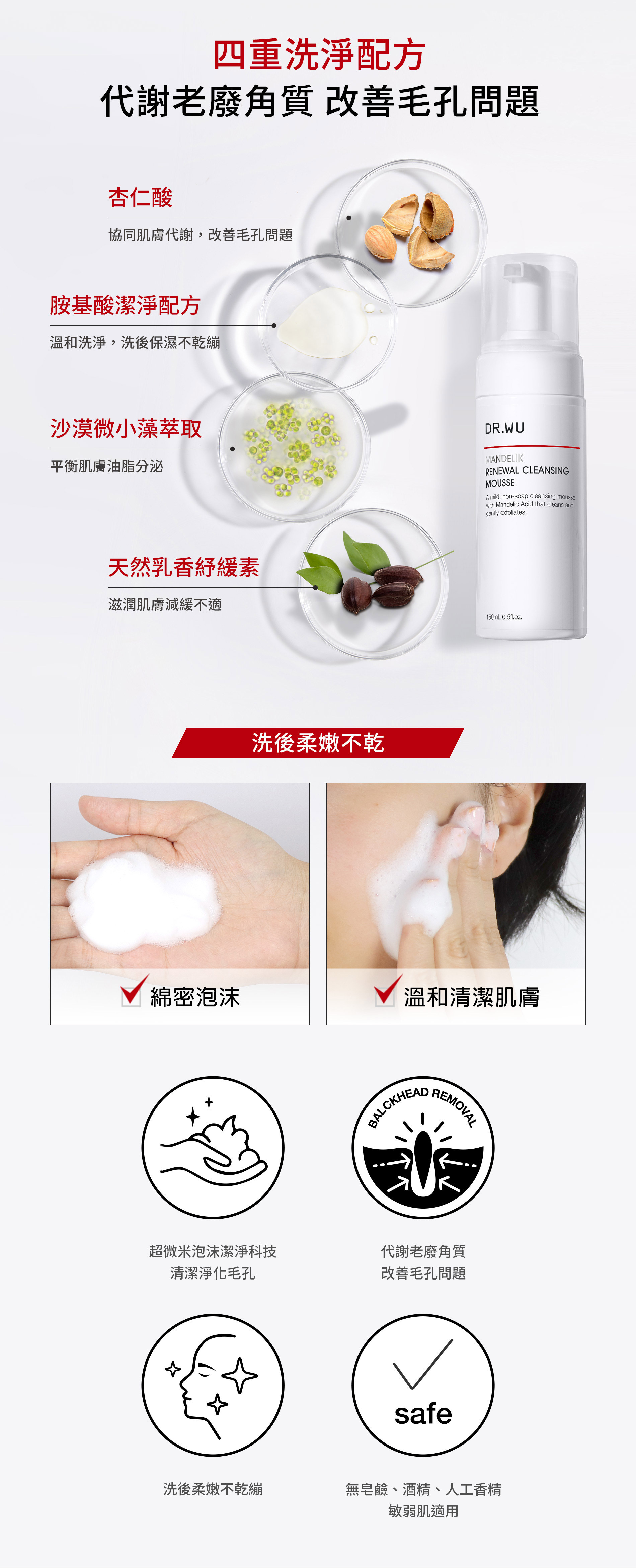 DR.WU創新超微米泡沫潔淨科技與高濃度杏仁酸完美結合,以綿密細緻的泡沫快速深入毛孔,帶走髒汙及多餘油脂;清潔同時溫和代謝老廢角質及黑、白頭粉刺,緊緻毛孔,還原細緻亮白肌。結合胺基酸保濕配方,深層潔淨同時洗後保濕不緊繃!全配方無皂鹼、酒精、色素、香精,敏弱肌膚質也適用。